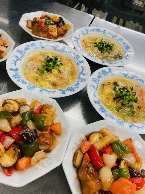中国料理コース料理、今回のコース料理のデザートは杏仁豆腐です。 33年間のポテトクラブの調理実習で3回目の酢豚に なります。北京風酢豚を始め四川風酢豚、鶏肉黒酢酢豚、今回は広東風酢豚と上海風酢豚の2種を実習しました。